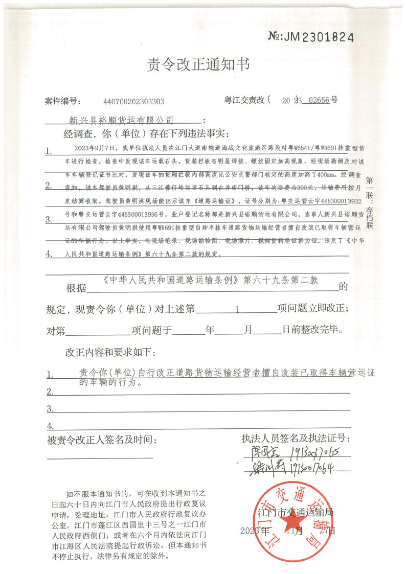 你(单位)因违反交通运输行政管理法规,本机关已作出行政处罚决定和责令改正通知书(具体内容详见附件)。依照《中华人民共和国民事诉讼法》第九十二条的规定,因受送达人采用其他方式无法送达,现向你(单位)公告送达《行政处罚决定书》和《责令改正通知书》。自公告之日起,经过30日即视为送达。
