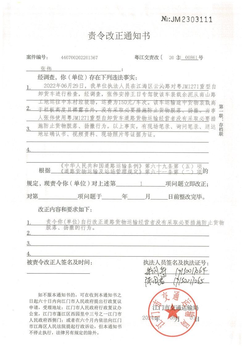 你(单位)因违反交通运输行政管理法规,本机关已作出行政处罚决定和责令改正通知书(具体内容详见附件)。依照《中华人民共和国民事诉讼法》第九十五条的规定,因受送达人采用其他方式无法送达,现向你(单位)公告送达《行政处罚决定书》和《责令改正通知书》。自公告之日起,经过30日即视为送达。