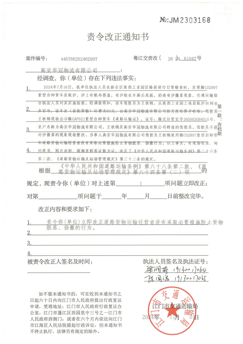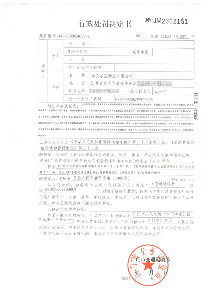 你(单位)因违反交通运输行政管理法规,本机关已作出行政处罚决定和责令改正通知书(具体内容详见附件)。依照《中华人民共和国民事诉讼法》第九十五条的规定,因受送达人采用其他方式无法送达,现向你(单位)公告送达《行政处罚决定书》和《责令改正通知书》。自公告之日起,经过30日即视为送达。