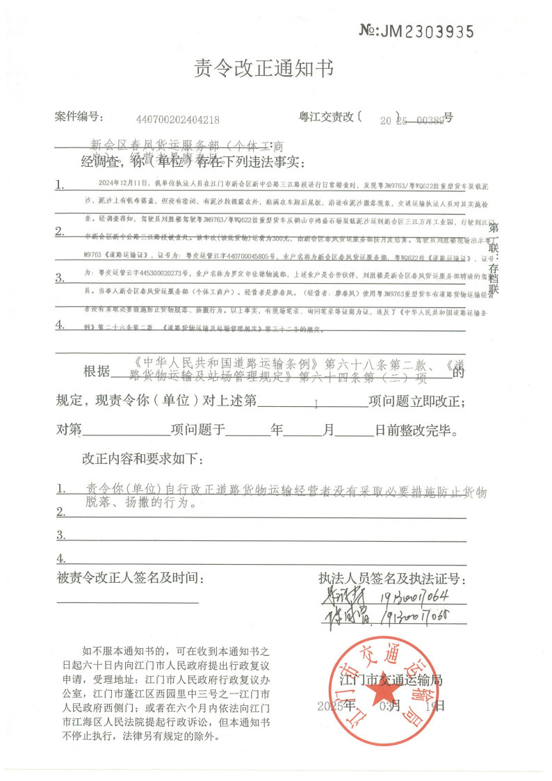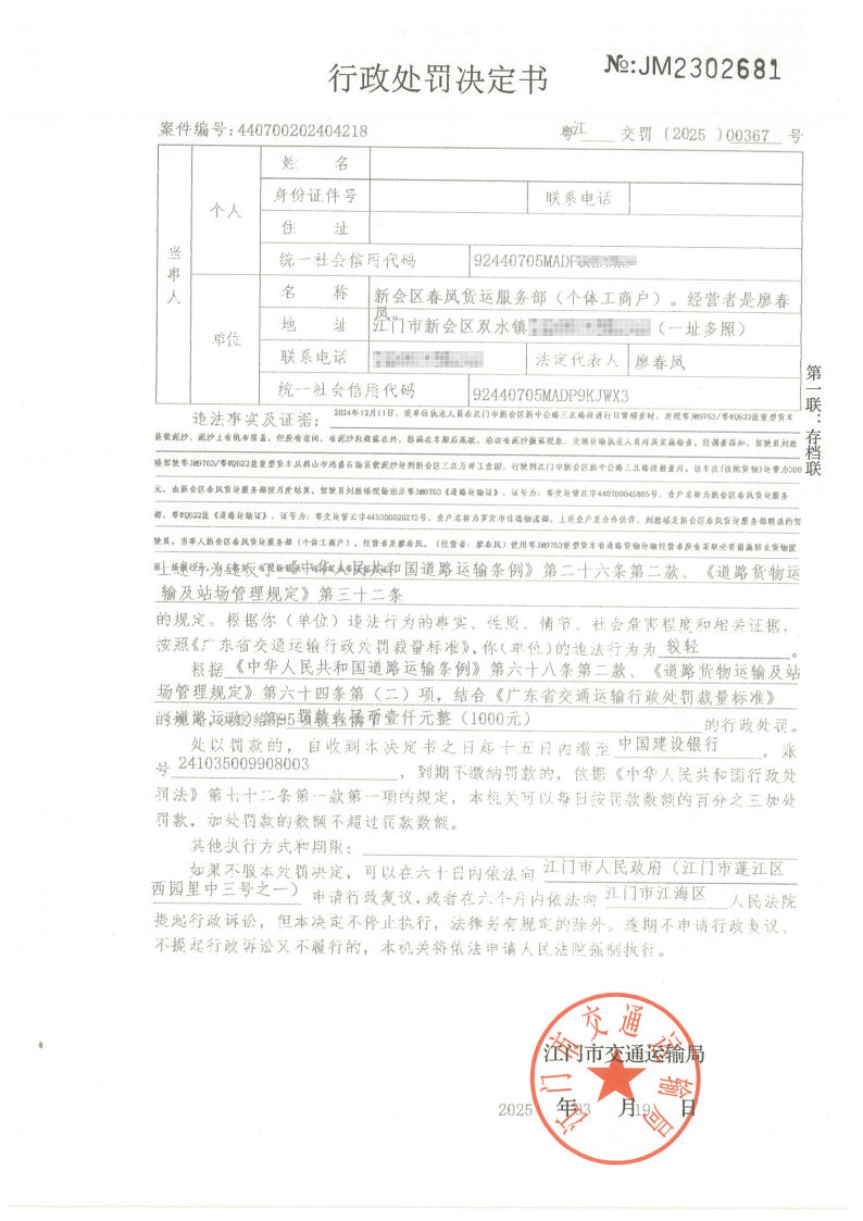 你(单位)因违反交通运输行政管理法规,本机关已作出行政处罚决定和责令改正通知书(具体内容详见附件)。依照《中华人民共和国民事诉讼法》第九十五条的规定,因受送达人采用其他方式无法送达,现向你(单位)公告送达《行政处罚决定书》和《责令改正通知书》。自公告之日起,经过30日即视为送达。