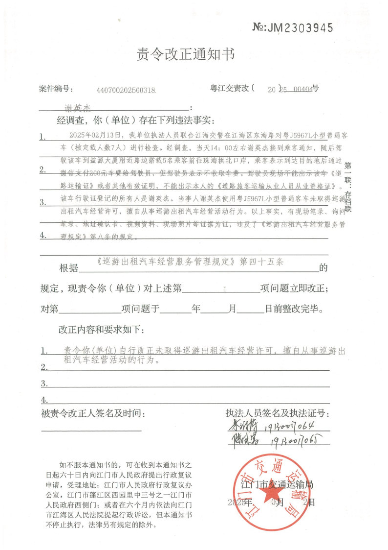 你(单位)因违反交通运输行政管理法规,本机关已作出行政处罚决定和责令改正通知书(具体内容详见附件)。依照《中华人民共和国民事诉讼法》第九十五条的规定,因受送达人采用其他方式无法送达,现向你(单位)公告送达《行政处罚决定书》和《责令改正通知书》。自公告之日起,经过30日即视为送达。