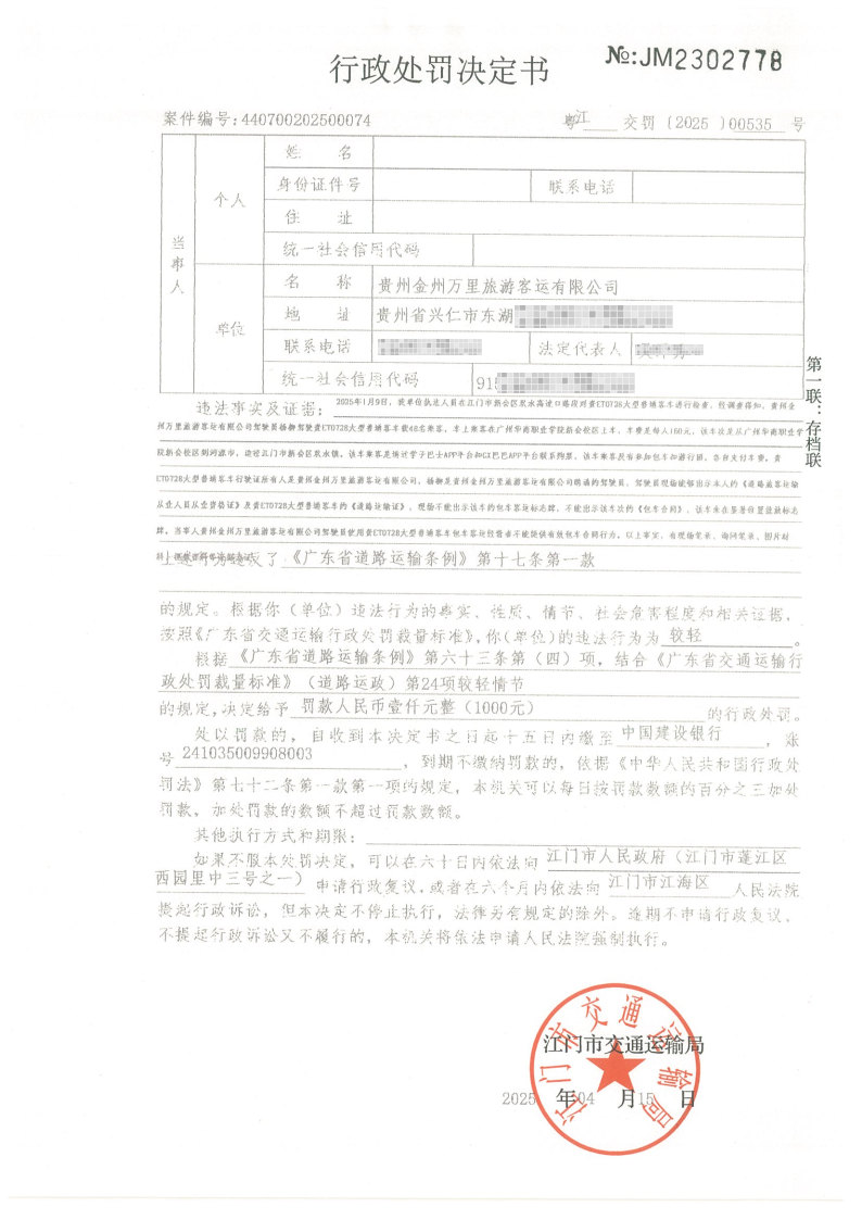 你(单位)因违反交通运输行政管理法规,本机关已作出行政处罚决定和责令改正通知书(具体内容详见附件)。依照《中华人民共和国民事诉讼法》第九十五条的规定,因受送达人采用其他方式无法送达,现向你(单位)公告送达《行政处罚决定书》和《责令改正通知书》。自公告之日起,经过30日即视为送达。