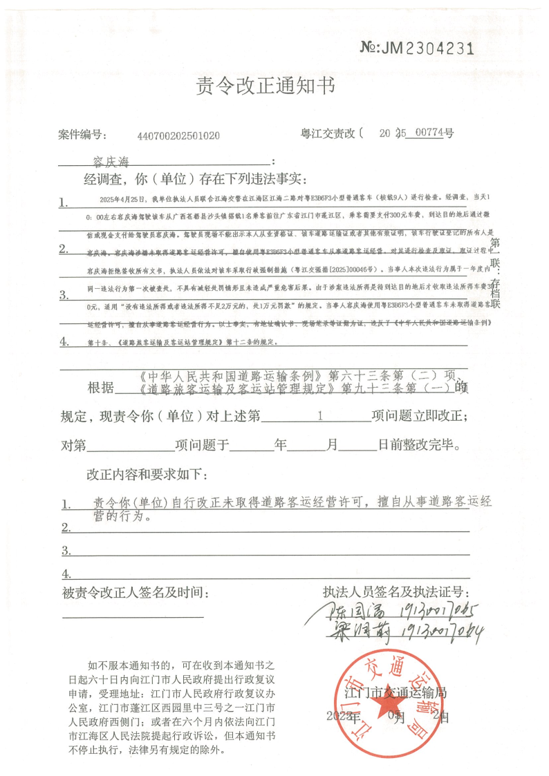 你(单位)因违反交通运输行政管理法规,本机关已作出行政处罚决定和责令改正通知书(具体内容详见附件)。依照《中华人民共和国民事诉讼法》第九十五条的规定,因受送达人采用其他方式无法送达,现向你(单位)公告送达《行政处罚决定书》和《责令改正通知书》。自公告之日起,经过30日即视为送达。