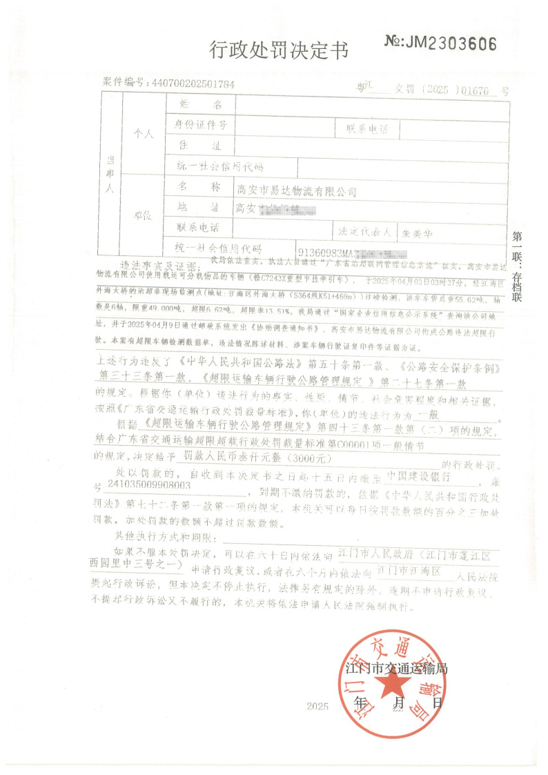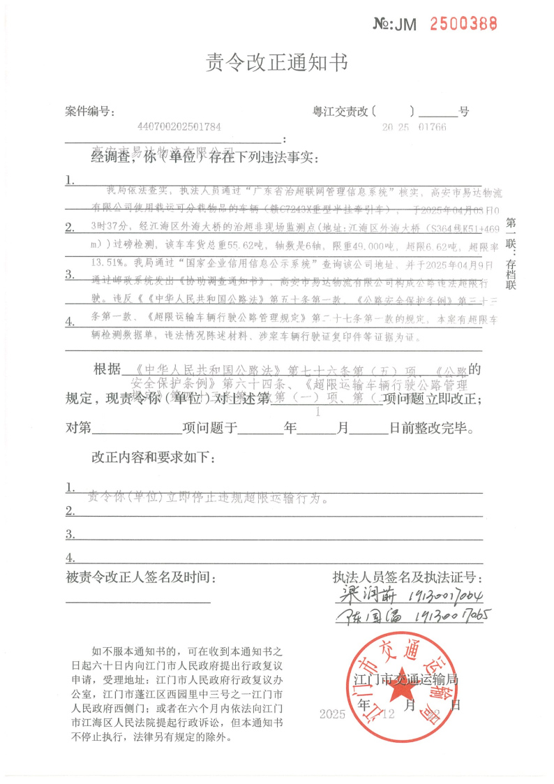 你(单位)因违反交通运输行政管理法规,本机关已作出行政处罚决定和责令改正通知书(具体内容详见附件)。依照《中华人民共和国民事诉讼法》第九十五条的规定,因无法以其他方式向你(单位)送达,现向你(单位)公告送达《行政处罚决定书》和《责令改正通知书》。自发出公告之日起,经过30日即视为送达。