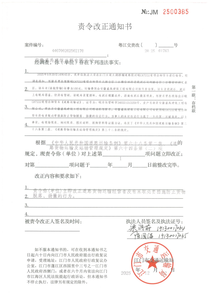 你(单位)因违反交通运输行政管理法规,本机关已作出行政处罚决定和责令改正通知书(具体内容详见附件)。依照《中华人民共和国民事诉讼法》第九十五条的规定,因无法以其他方式向你(单位)送达,现向你(单位)公告送达《行政处罚决定书》和《责令改正通知书》。自发出公告之日起,经过30日即视为送达。