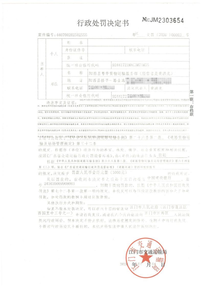 阳西县粤华货物运输服务部(经营者为黄洪光):