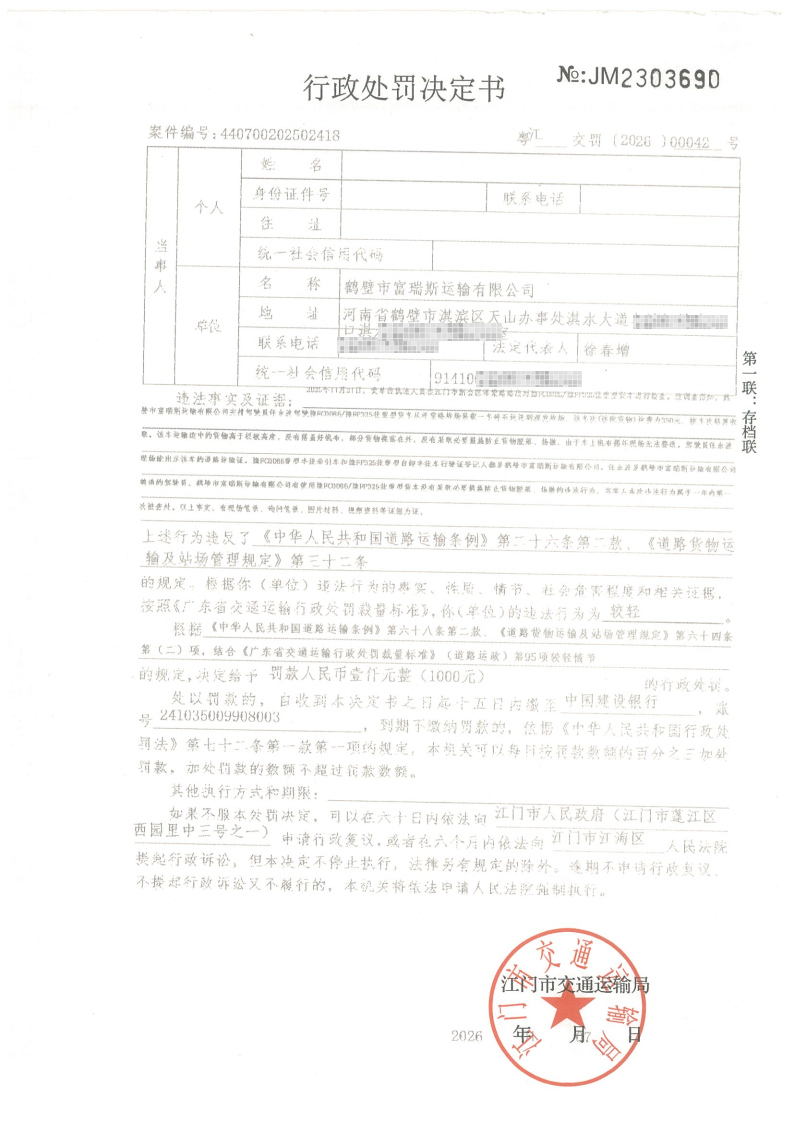 你(单位)因违反交通运输行政管理法规,本机关已作出行政处罚决定和责令改正通知书(具体内容详见附件)。依照《中华人民共和国民事诉讼法》第九十五条的规定,因无法以其他方式向你(单位)送达,现向你(单位)公告送达《行政处罚决定书》和《责令改正通知书》。自发出公告之日起,经过30日即视为送达。