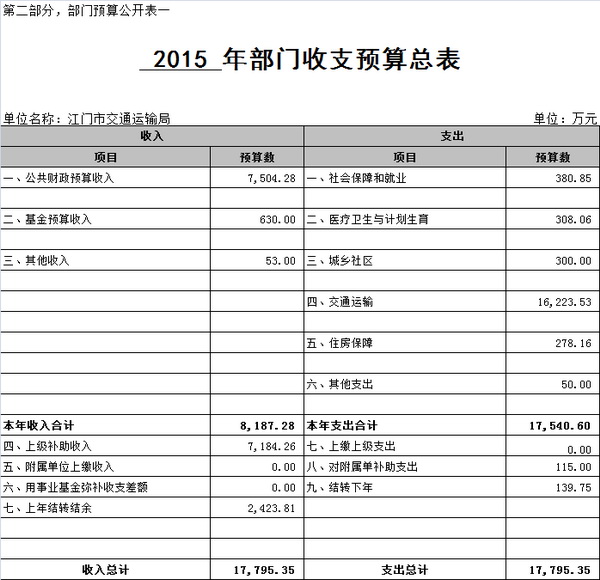 2015 年部门支出预算17795.35万元,其中本年支出17540.6万元,占98.57%,包括:社会保障和就业(类)支出380.85万元,占2.17%;医疗卫生与计划生育(类)支出308.06万元,占1.76%;城乡社区(类)支出300.00万元,占1.71%;交通运输(类)支出16223.53万元,占92.49%;住房保障(类)支出278.16万元,占1.59%;其他支出50万元,占0.28%。对附属单位补助支出115万元,占0.65%;结转下年支出139.75万元,占0.78%。