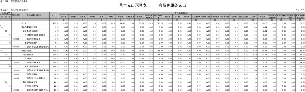 项目支出预算5511.19万元,主要支出项目有公路水路运输支出1110.63万元、公共交通运营补助支出3681.16万元、其他交通运输支出89.40万元、港口建设费330.00万元、城市基础设施配套费300.00万元。与上年比增加主要是增加公交优先发展专项资金3048.00万元,新能源汽车应用推广专项资金1183.16万元,江门市市区城市公共交通专项规划修编300万元等项目支出。