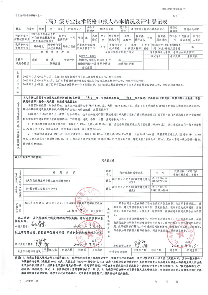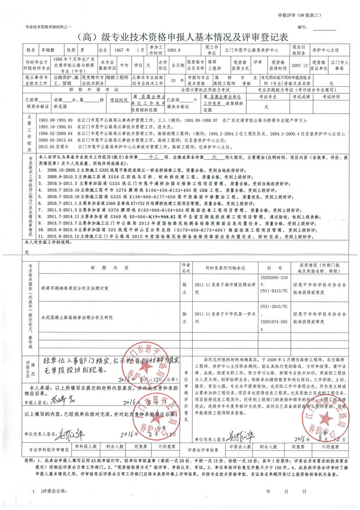 根据《广东省交通运输厅关于做好2016年度路桥港航 船舶工程高级专业技术资格评审材料报送工作的通知》(粤交人〔2016〕701号)要求,现将高级专业技术资格申报人郑秦生、何国峰、岑瑞勤专业技术资格申报情况予以公示。公示期间,如对相关资格资料有任何异议,可通过来信、来电、来访等形式向我局反映。公示时间:2016年9月19日至2016年9月27日。