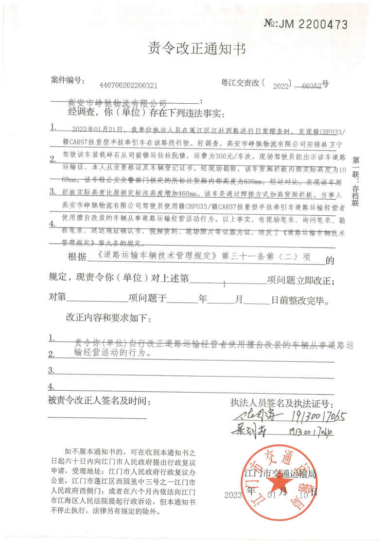 你(单位)因违反交通运输行政管理法规,本机关已作出行政处罚决定和责令改正通知书(具体内容详见附件)。依照《中华人民共和国民事诉讼法》第九十二条的规定,因受送达人采用其他方式无法送达,现向你(单位)公告送达《行政处罚决定书》和《责令改正通知书》。自公告之日起,经过30日即视为送达。