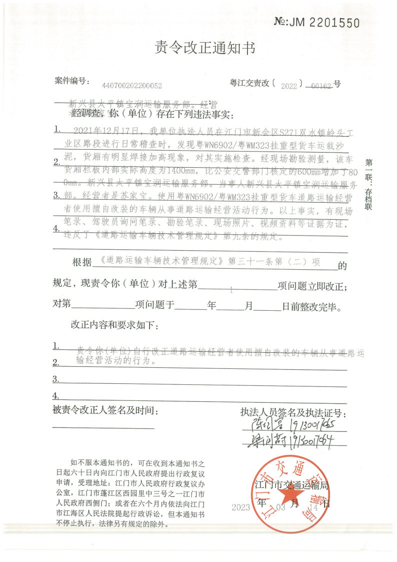 你(单位)因违反交通运输行政管理法规,本机关已作出行政处罚决定和责令改正通知书(具体内容详见附件)。依照《中华人民共和国民事诉讼法》第九十二条的规定,因受送达人采用其他方式无法送达,现向你(单位)公告送达《行政处罚决定书》和《责令改正通知书》。自公告之日起,经过30日即视为送达。