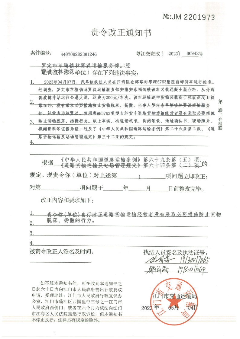 你(单位)因违反交通运输行政管理法规,本机关已作出行政处罚决定和责令改正通知书(具体内容详见附件)。依照《中华人民共和国民事诉讼法》第九十二条的规定,因受送达人采用其他方式无法送达,现向你(单位)公告送达《行政处罚决定书》和《责令改正通知书》。自公告之日起,经过30日即视为送达。