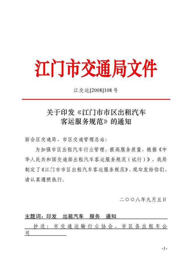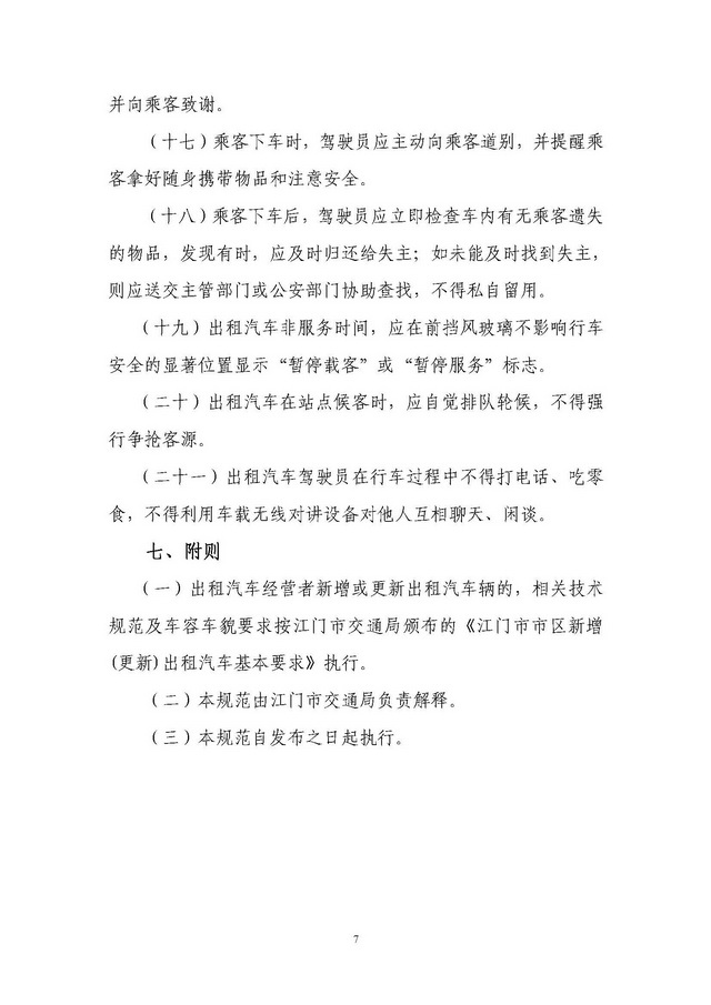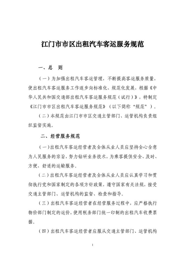 关于印发《江门市市区出租汽车客运服务规范》的通知 【已废止】_政策法规_江门市交通运输局