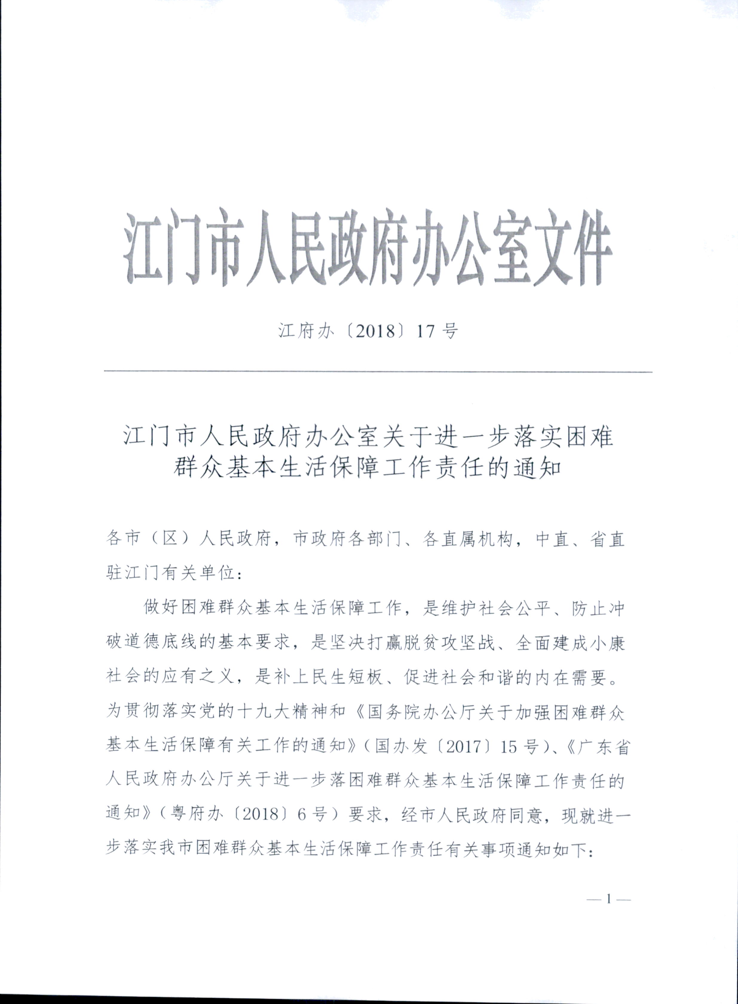 江府办[2018]17号_太阳3娱乐关于进一步落实困难群众基本生活保障工作责任的通知_政策法规文件_江门市民政局