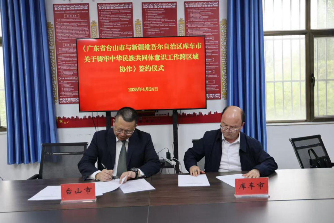 近日,广东江门台山市民族宗教局与新疆库车市民族宗教局在新疆库车市举行《广东省台山市与新疆维吾尔自治区库车市关于铸牢中华民族共同体意识工作的跨区域协作交流协议》签约仪式,开启两地交流合作新篇章。