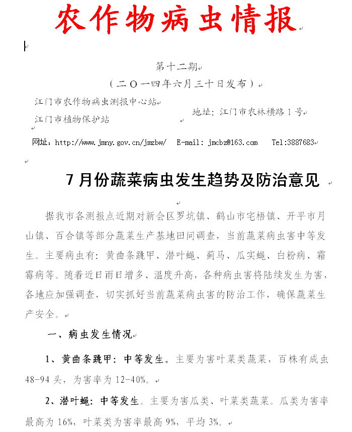 2014年农作物病虫情报第十二期<br>(7月份蔬菜病虫发生趋势及防治意见 )_工作简报_江门市农业农村局