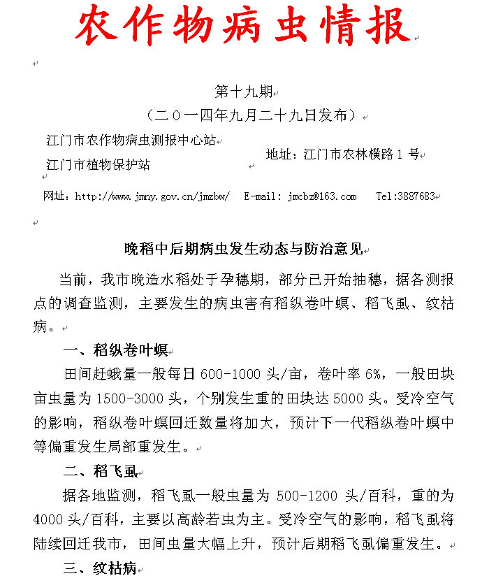 2014年农作物病虫情报第十九期(晚稻中后期病虫发生动态与防治意见)_工作简报_江门市农业农村局