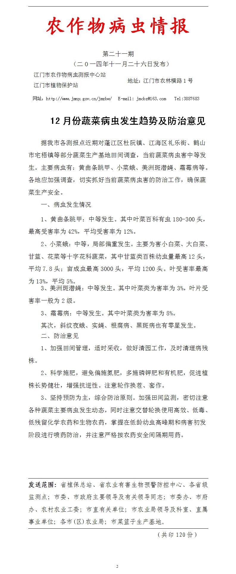 2014年农作物病虫情报第二十一期<br>(12月份蔬菜病虫发生趋势及防治意见)_工作简报_江门市农业农村局