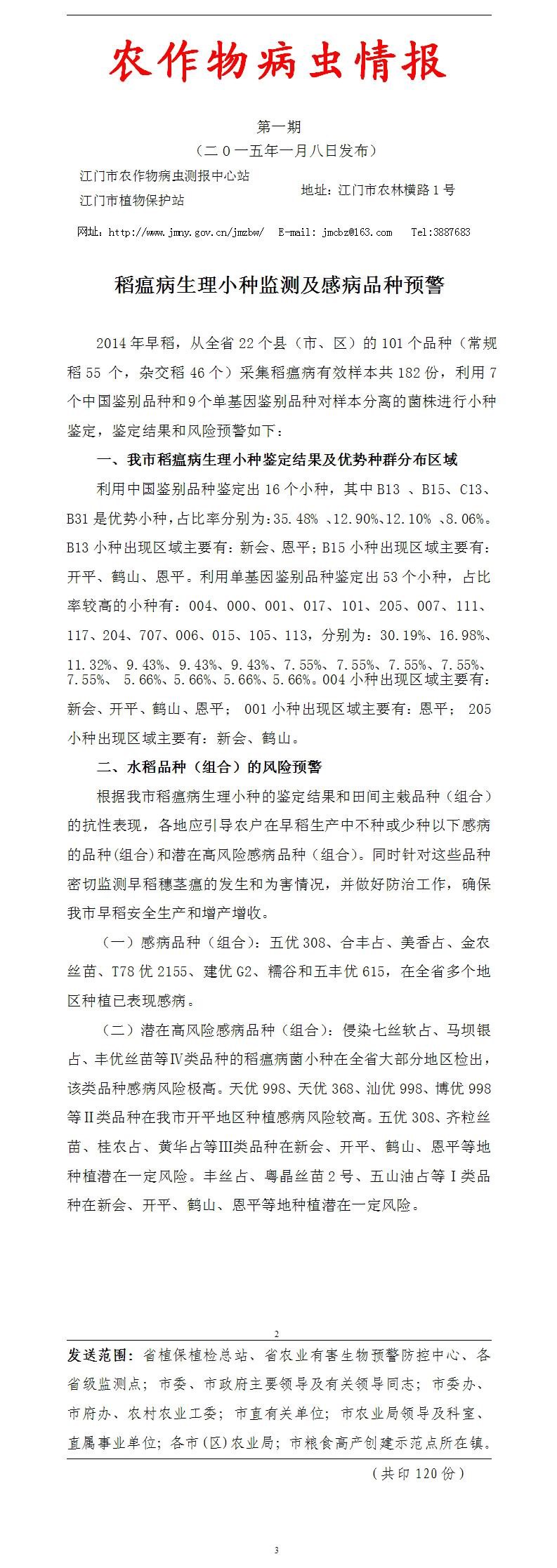 2015年农作物病虫情报第一期(稻瘟病生理小种监测及感病品种预警)_工作简报_江门市农业农村局