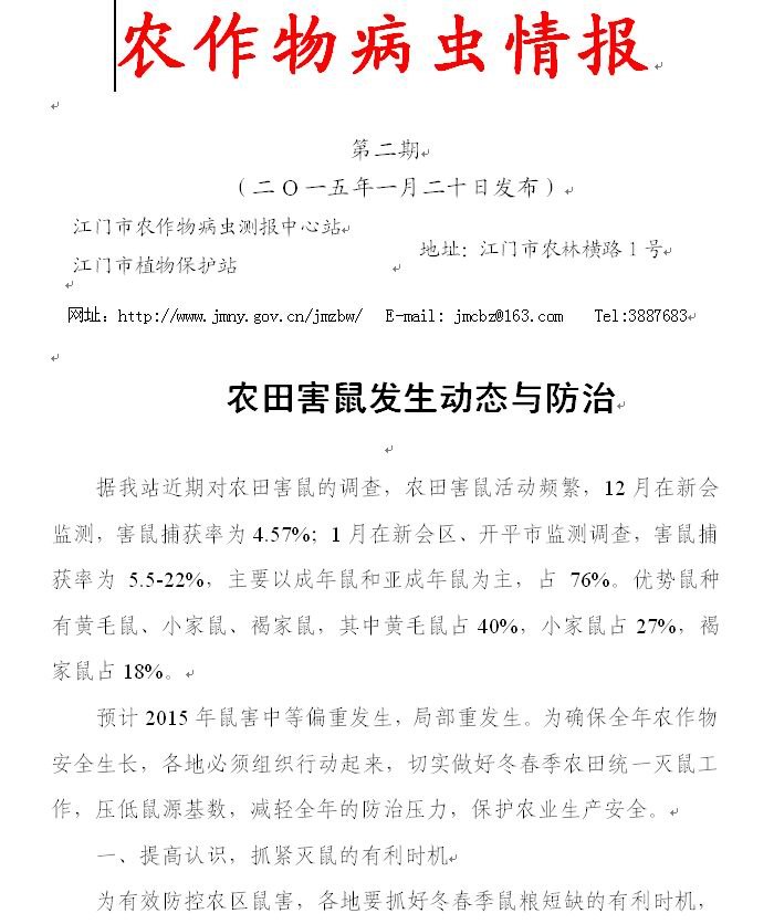 2015年农作物病虫情报第二期(农田害鼠发生动态与防治)_工作简报_江门市农业农村局