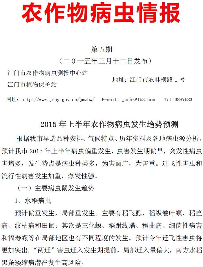 2015年农作物病虫情报第五期<br>(2015 年上半年农作物病虫发生趋势预测)_工作简报_江门市农业农村局