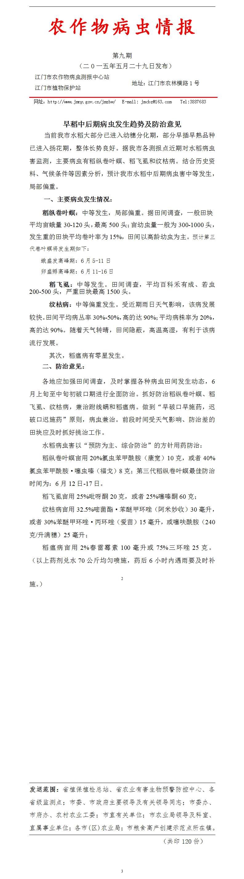 2015年农作物病虫情报第九期 (早稻中后期病虫发生趋势及防治意见)_工作简报_江门市农业农村局