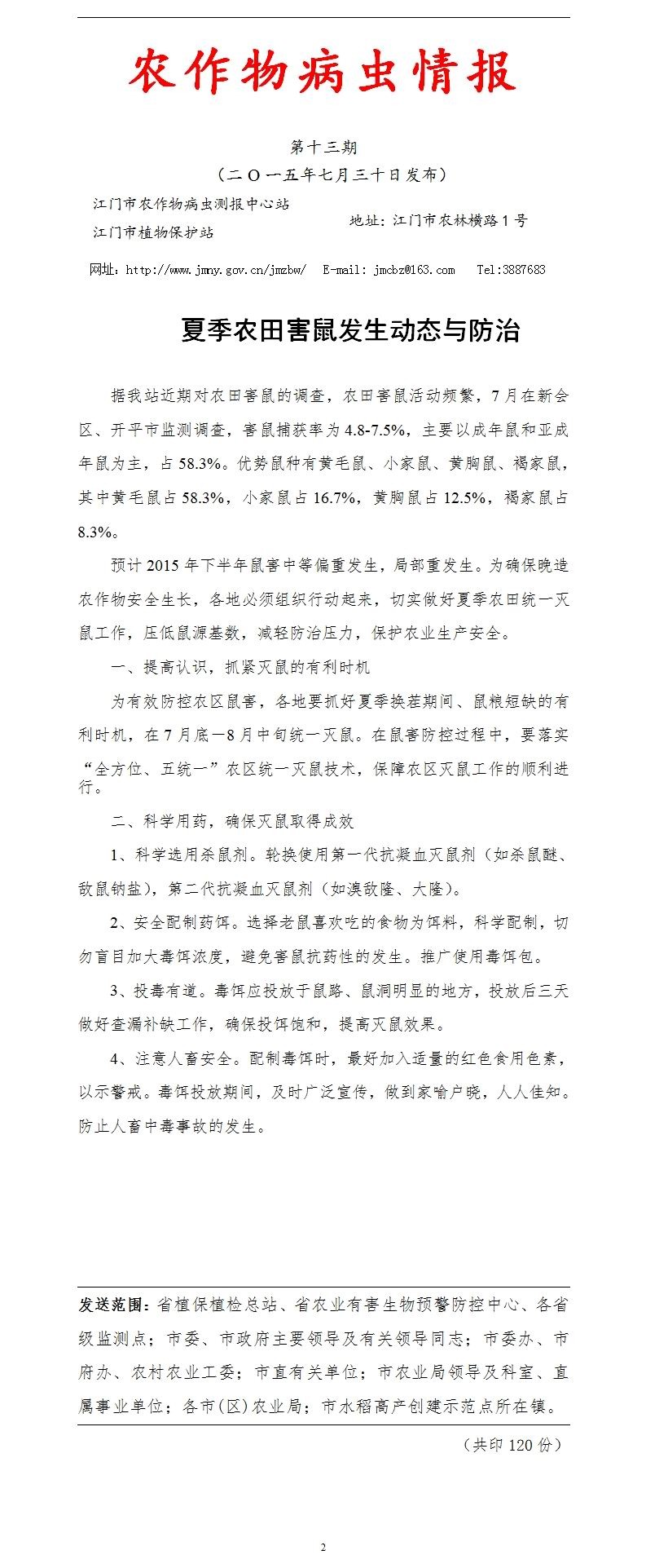 2015年农作物病虫情报第十三期(夏季农田害鼠发生动态与防治)_工作简报_江门市农业农村局