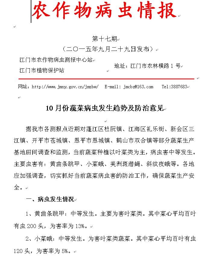 2015年农作物病虫情报第十七期(10月份蔬菜病虫发生趋势及防治意见)_工作简报_江门市农业农村局