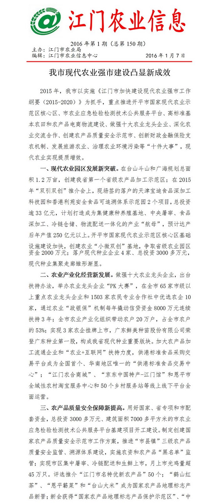 2016年江门农业信息 第1期(总第150期)_工作简报_江门市农业农村局