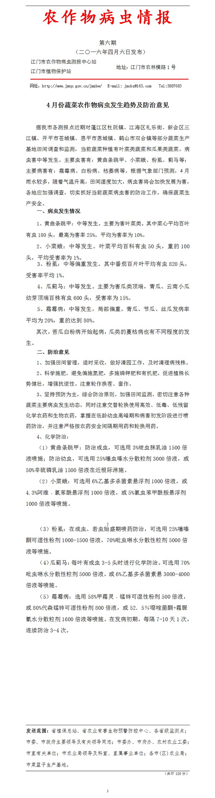 2016年农作物病虫情报 第六期 <br>(4月份蔬菜农作物病虫发生趋势及防治意见)_工作简报_江门市农业农村局