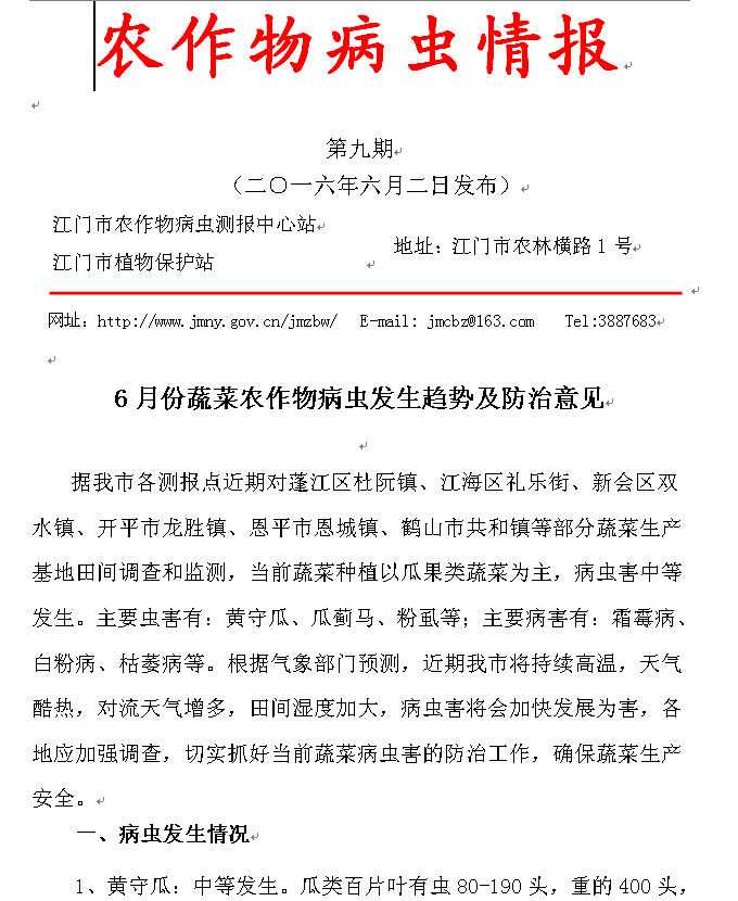 2016年农作物病虫情报 第九期(6月份蔬菜农作物病虫发生趋势及防治意见)_工作简报_江门市农业农村局