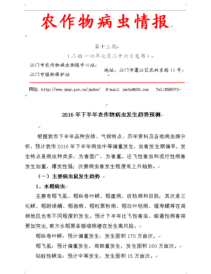 2016年农作物病虫情报 第十三期<br>(2016年下半年农作物病虫发生趋势预测)_工作简报_江门市农业农村局