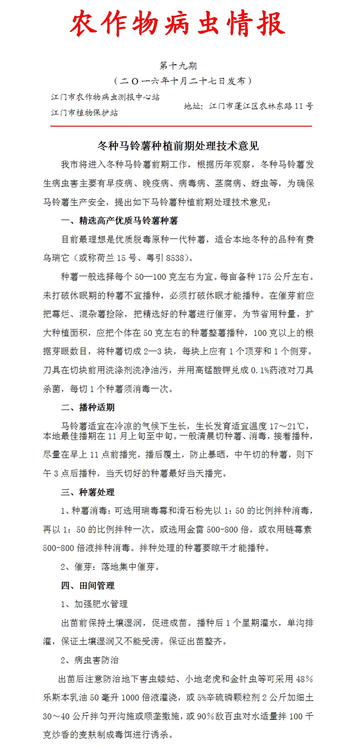 2016年农作物病虫情报 第十九期<br>(冬种马铃薯种植前期处理技术意见)_工作简报_江门市农业农村局