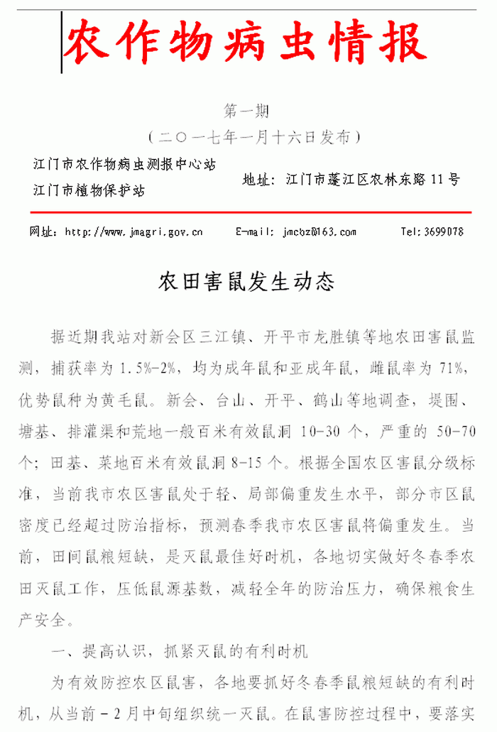 2017年农作物病虫情报 第一期<br>(农田害鼠发生的动态)_工作简报_江门市农业农村局