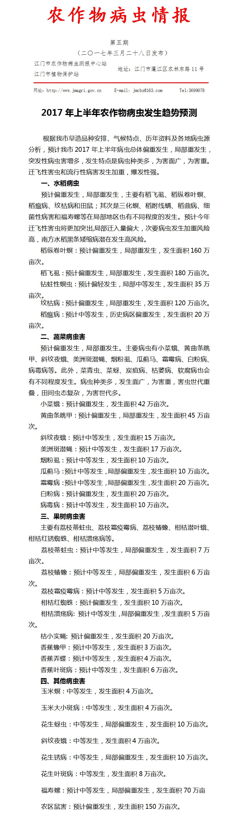 2017年农作物病虫情报 第五期(2017年上半年农作物病虫发生趋势预测)_工作简报_江门市农业农村局