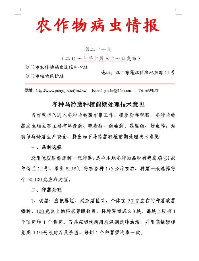 江门201721农作物病虫情报(第21期)冬种马铃薯种植前期处理技术意见(红头)_工作简报_江门市农业农村局