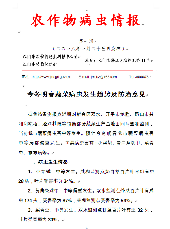 江门2018农作物病虫情报(第一期)今冬明春蔬菜病虫发生趋势及防治意见_工作简报_江门市农业农村局
