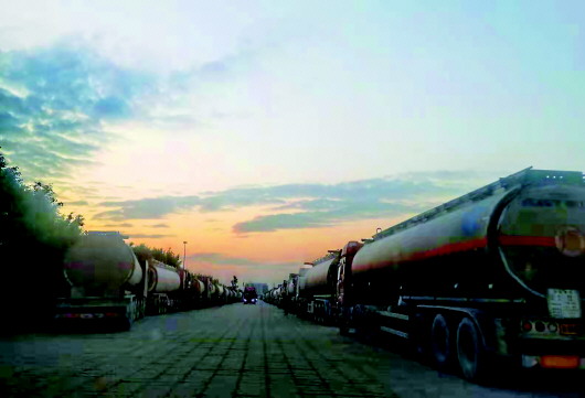 防城港汇通油库外,近200米长的道路两侧停满了等待装油的油罐车。 记者王成摄