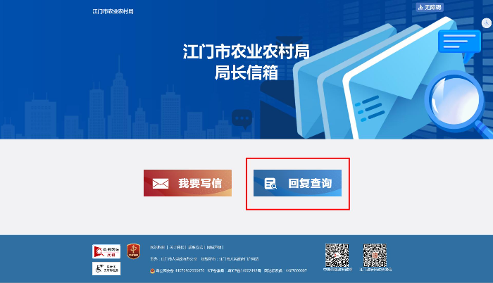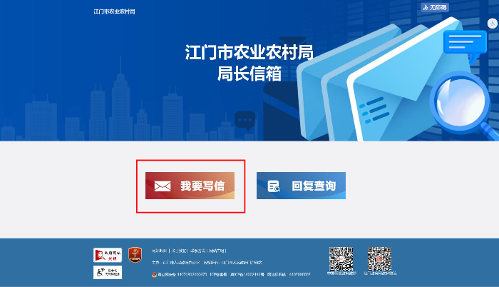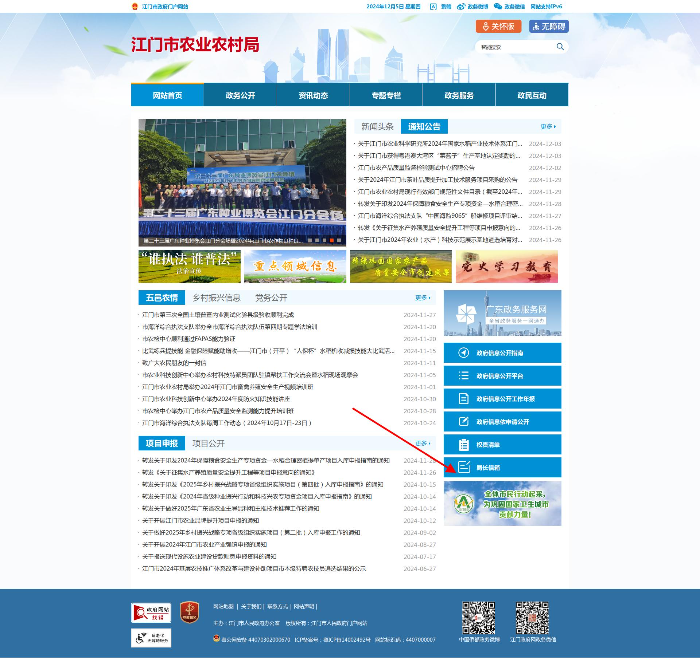 第一步:登录政府门户网站江门市农业农村局部门频道(网址:/bmpd/jmsnyncj/index.html)。进入右下角点击“局长信箱”栏目。