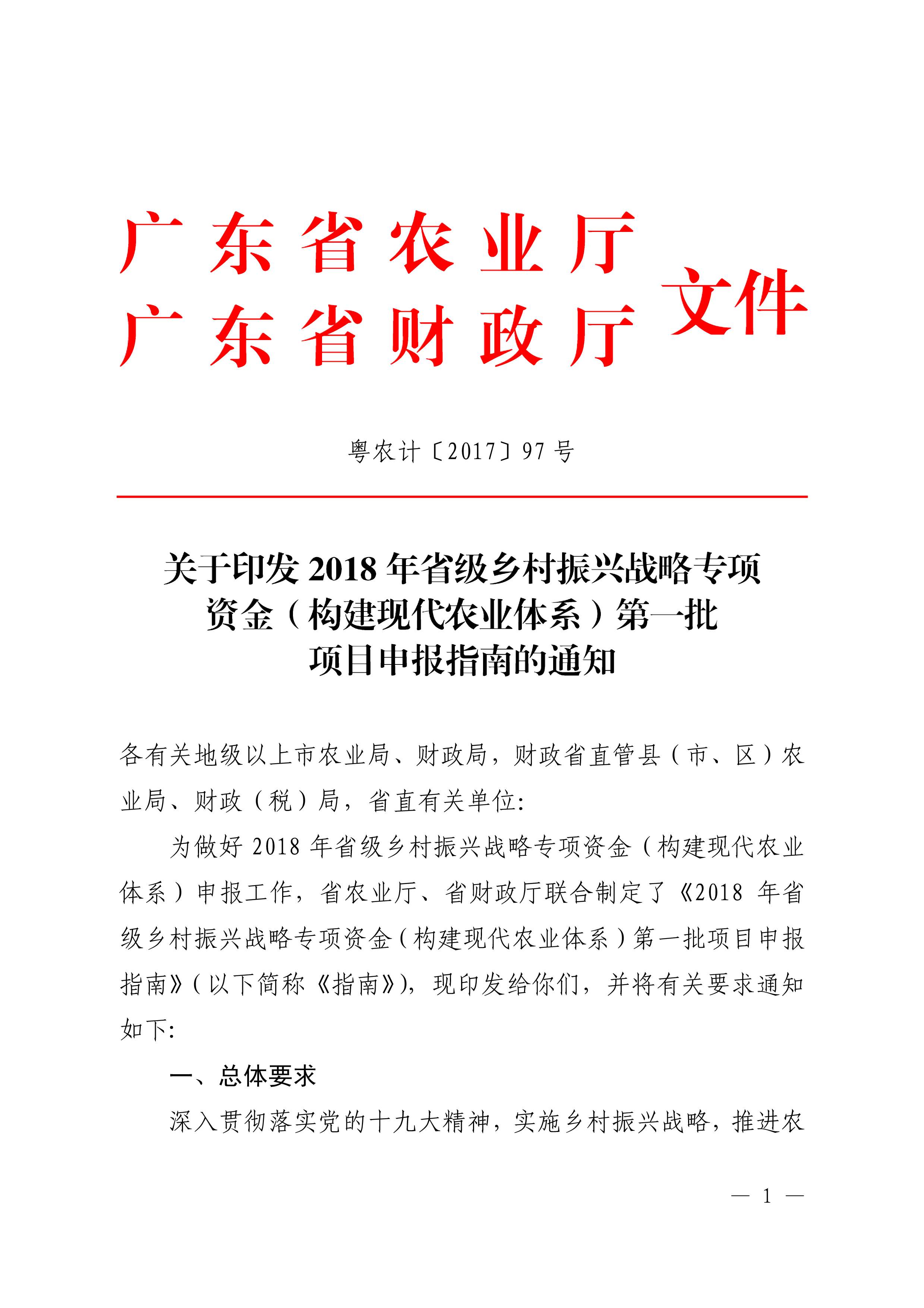 关于印发2018年省级乡村振兴战略专项资金(构建现代农业体系)第一批项目申报指南的通知 粤农计[2017]97号(计划处.78页)联合发文_项目申报_江门市农业农村局