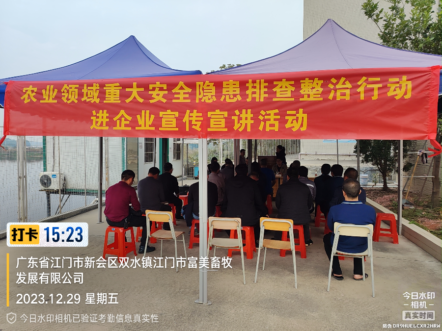 为全面贯彻落实党的二十大精神和习近平总书记关于安全生产重要论述,按照党中央、国务院决策部署,进一步落实全国安全生产电视电话会议、国务院安委会全体会议精神和国务院安委会2023年工作要点有关要求,推动重大安全风险防控措施落实,根据江门市安全生产委员会《江门市重大事故隐患专项排查整治2023行动总体方案》工作部署,2023年12月29日,市农业农村局一行4人会同新会区农业农村局相关负责同志到江门市富美畜牧发展有限公司开展2023年农业领域重大安全隐患排查整治行动宣讲暨农村沼气安全生产检查。