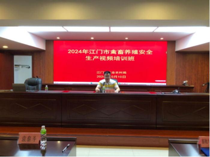 为深入贯彻习近平总书记关于安全生产的重要指示批示精神,切实做好我市畜禽养殖行业安全生产工作,筑牢安全生产防线,营造浓厚的安全生产氛围,2024年10月10日上午,江门市农业农村局组织开展2024年江门市畜禽养殖安全生产视频培训班。此次视频培训设市级主会场和各县分会场。市农业农村局总畜牧兽医师袁泰斗,畜牧与饲料科、兽医与屠宰管理科、市动物卫生技术服务中心、市动物疫病预防控制中心业务工作人员在主会场参加,各县(市、区)农业农村局负责同志、业务骨干以及部分畜禽养殖场(户)负责人在分会场参加。