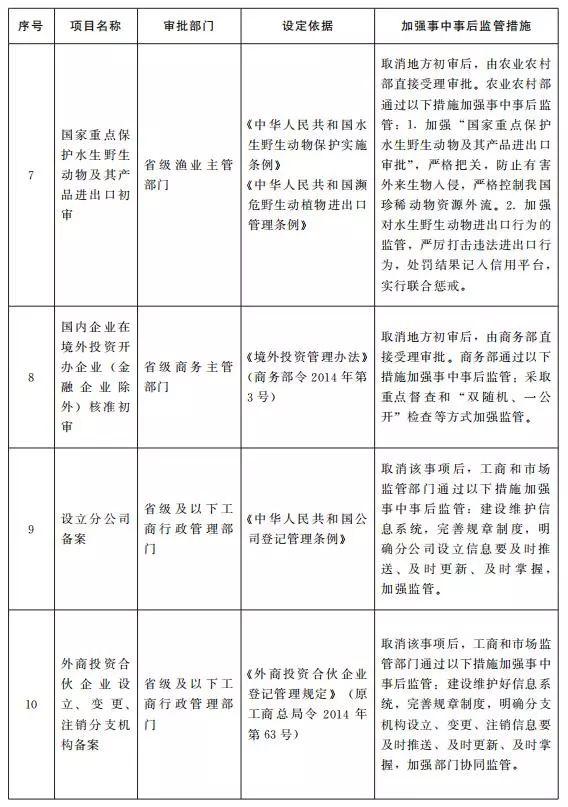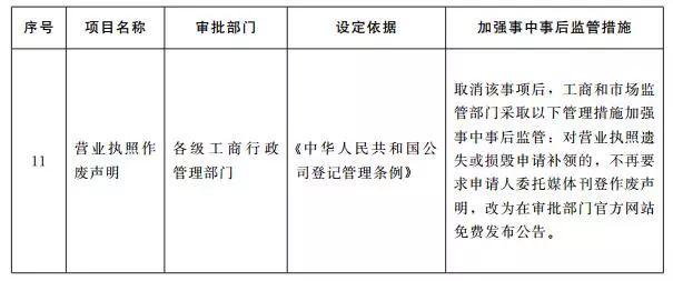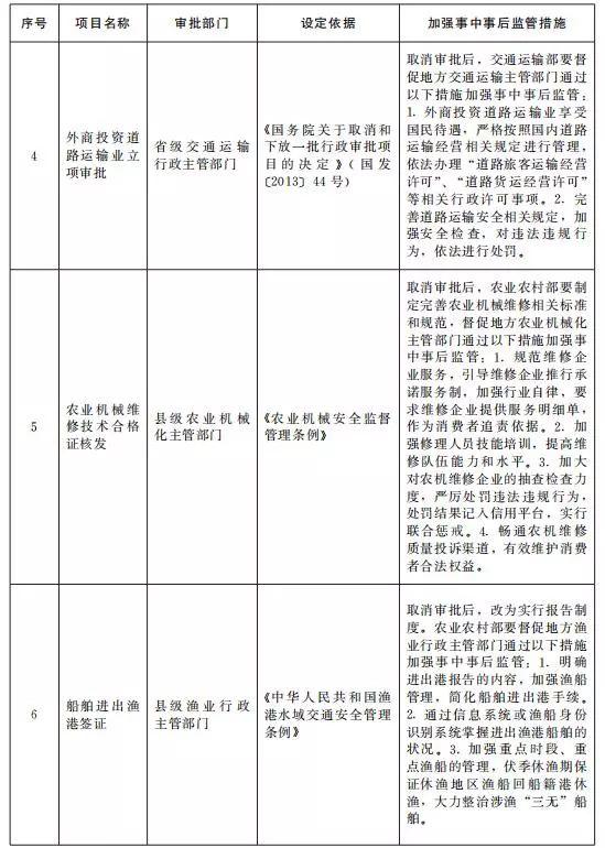 经研究论证,国务院决定取消11项行政许可等事项,现予公布。另有6项依据有关法律设定的行政许可事项,国务院将依照法定程序提请全国人民代表大会常务委员会修订相关法律规定。对取消的行政许可等事项,相关部门要制定完善事中事后监管细则,自本决定发布之日起20个工作日内按规定向社会公布,并加强宣传解读、确保落实到位。