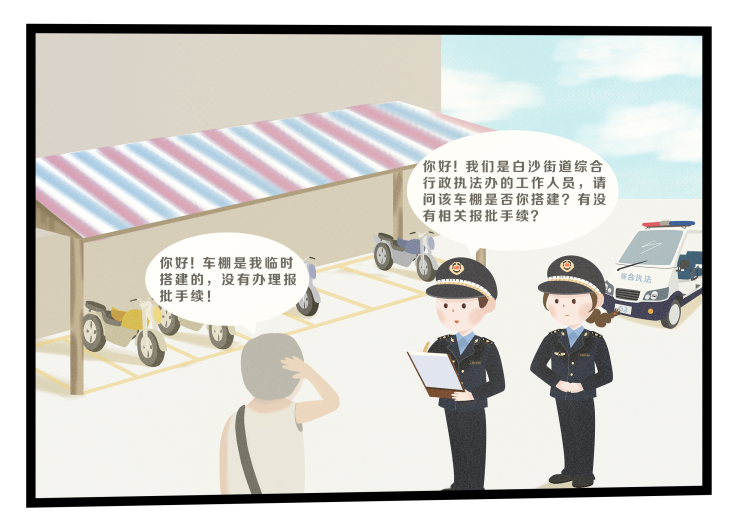 本期案例改编于白沙街道真实案例,白沙街道综合行政执法办执法人员在日常巡查过程中,发现美景里某居民楼间公共道路存在违建现象,当事人在公共道路擅自搭建构筑物(车棚)。经查,违建当事人并没进行相关报批手续,属于擅自在城市道路搭建建筑物、构筑物的行为。执法人员查清相关事实,耐心为当事人释法说理,并责令当事人限期改正。当事人认识到违法行为的法律后果,悔改态度良好,认真配合执法人员开展工作,并答应在限期内自行整改。经现场复查,当事人及时整改完成并恢复原状,执法人员依法不予行政处罚。