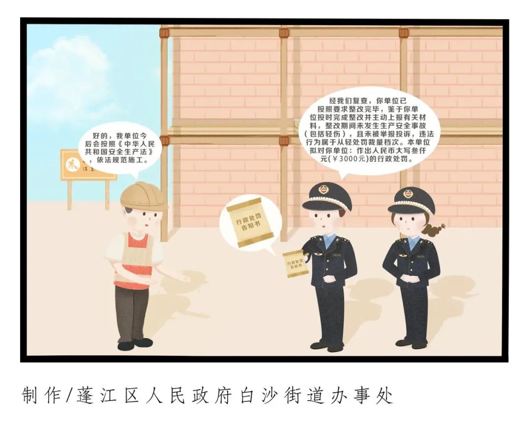 本期案例改编于白沙街道真实案例,白沙街道办事处执法人员在巡查检查企业的过程中,现场检查发现某企业在外墙翻新项目施工作业期间未为2名从业人员提供符合国家标准或行业标准的劳动防护用品(安全帽、劳保服、安全带),违反了《中华人民共和国安全生产法》第四十五条的规定,随后执法人员对该企业负责人进行安全教育宣传并向该企业发出责令整改通知书,要求在整改日期内改正。经复查,该企业已按照要求整改完毕,鉴于按时完成整改并主动上报有关材料,整改期间未发生生产安全事故(包括轻伤),且未被举报投诉,违法行为属于从轻处罚裁量档次,依法对其从轻处罚。