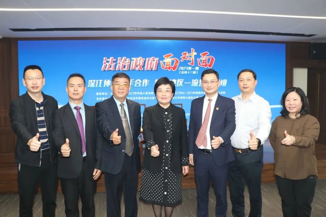 开放交流、碰撞思想、共商法治。2月23日下午,2023年首期“法治政府面对面”节目走进深圳国际仲裁院江门中心。江门市司法局党组书记、局长芶晓彤,江门市委副秘书长、深圳国际仲裁院江门中心主任、江门仲裁委员会主任黄郭勇,市中级人民法院三级高级法官谢敏忠,市工商联四级调研员林小芳做客节目,畅谈深江仲裁合作,携手共建湾区一流营商环境。江门市总商会常务委员黄晓涛,江门照明电器行业协会秘书长罗志达,市司法局、市中级人民法院、市工商联部分干部、企业家和群众代表50余人受邀参加节目,市司法局四级调研员、江门仲裁仲裁工作事务中心负责人蓝军主持节目。