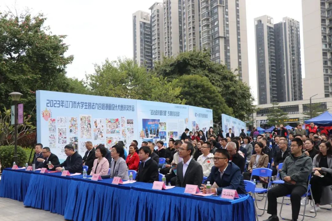 现场设置宣传展板,以图文展示江门市改革开放45周年法治成果、公共法律服务建设及工作成效、大学生普法九宫格漫画大赛获奖作品等内容。