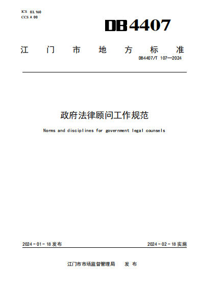 2月18日起,江门地方标准《政府法律顾问工作规范》(DB4407/T 107-2024)正式实施。据悉,这是全省首部政府法律顾问领域地方标准,是江门深入推进政府法律顾问制度,提升法治护航高质量发展的又一新动作。