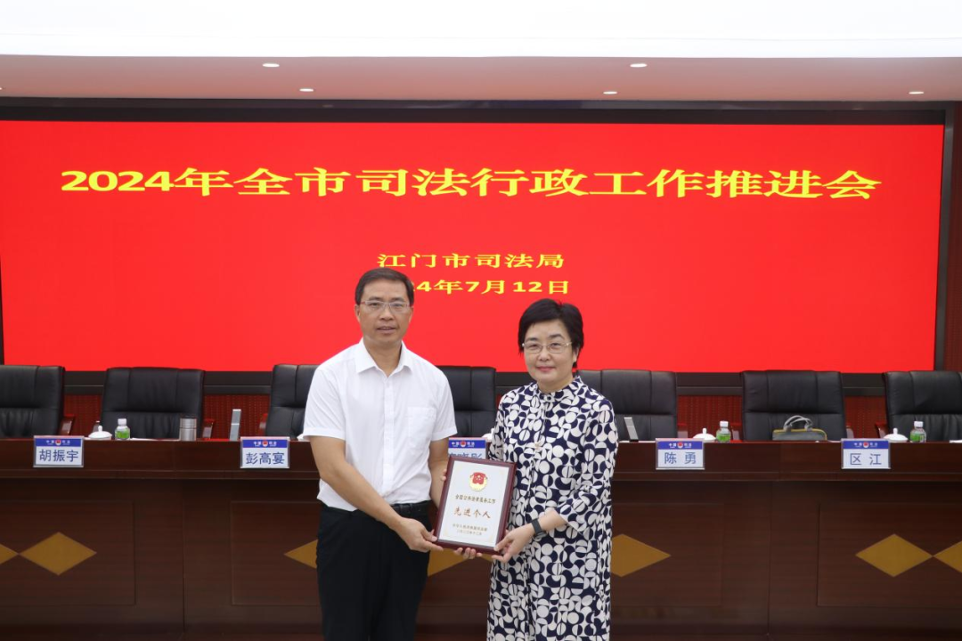 7月12日,为全面总结上半年工作,分析形势任务,谋划下半年重点工作任务,江门市召开司法行政工作暨贯彻落实全省涉外法治建设会议精神推进会。会议通报了全市司法行政系统队伍建设情况,传达了全省涉外法治建设工作会议精神并对我市推进涉外法治建设工作作了部署,鹤山市司法局作工作经验交流,对全国法律援助和公共法律服务工作先进集体和先进个人以及获评市“两优一先”单位及个人进行了表彰。